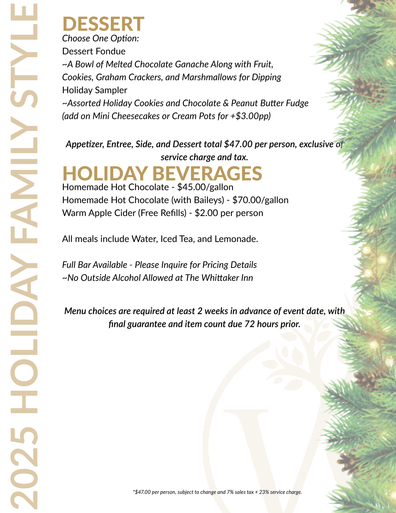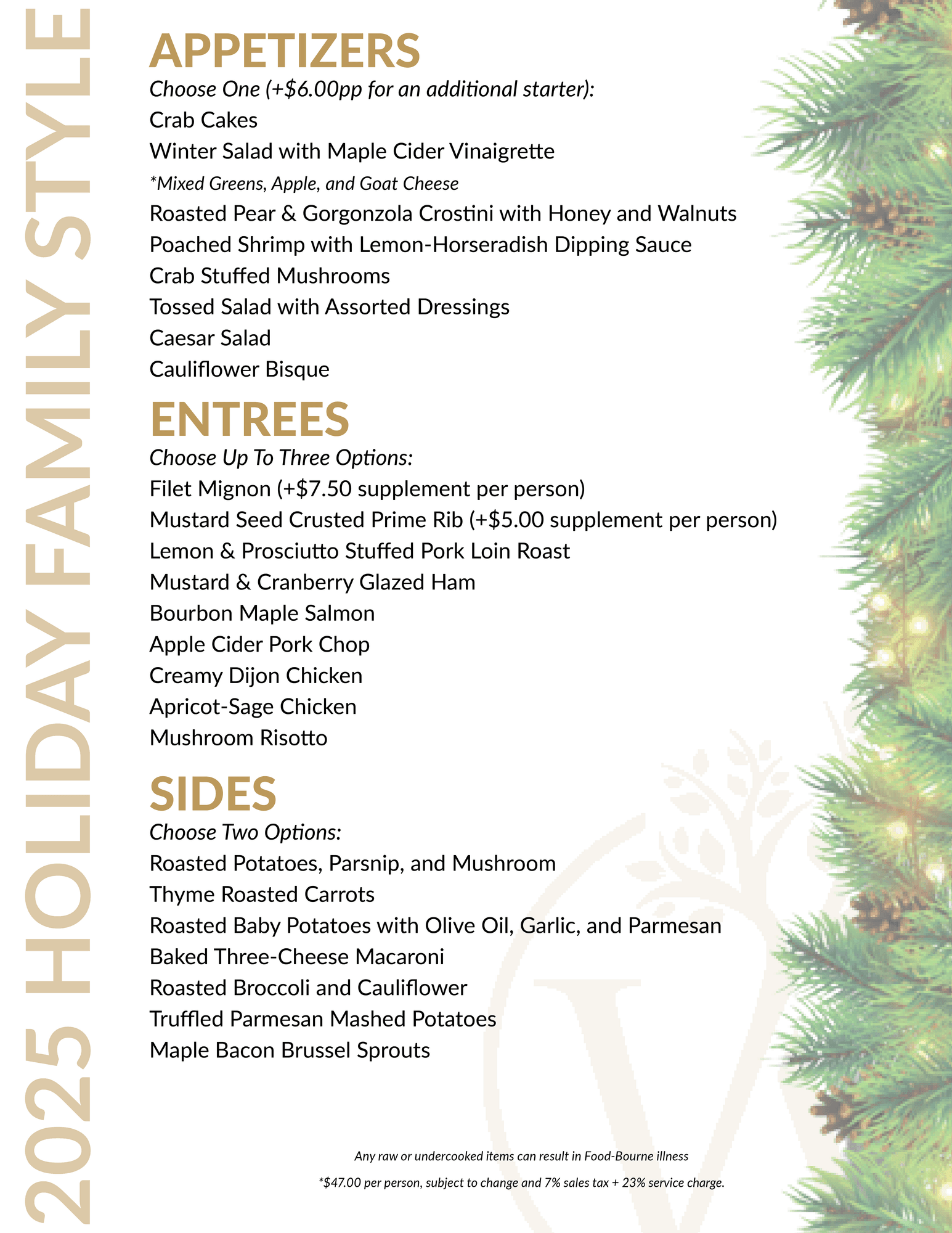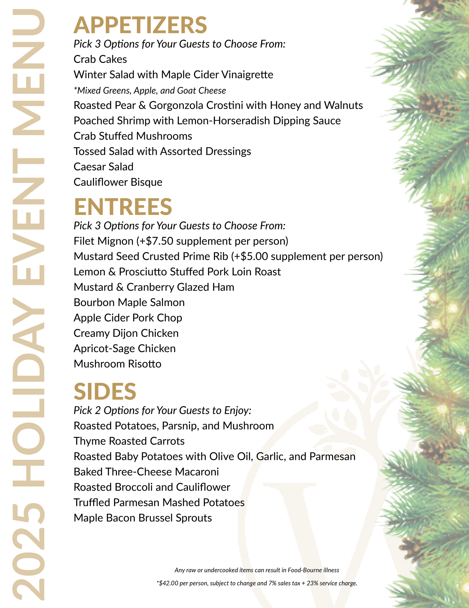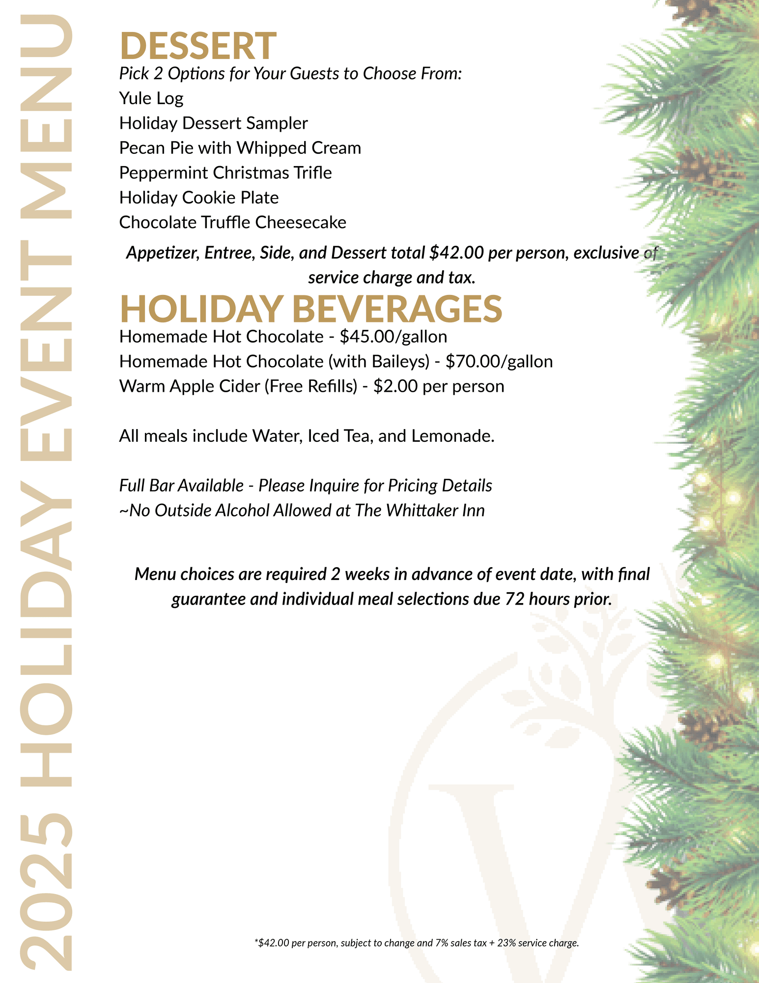 For our "Holiday Dinner Event Menu", the event planner will choose 3 appetizer options, 3 entree options, 2 side options, and 2 dessert options for their guests to choose from. Guests will pre-order their meals based on the options that the event planner has chosen. The meals will be mostly or completely plated for guests to enjoy during the event. Menu options chosen by the event planner are required at least 2 weeks in advance of the event date, with final guarentee of numbers and each individuals meal selections due 72 hours prior to the event date.
