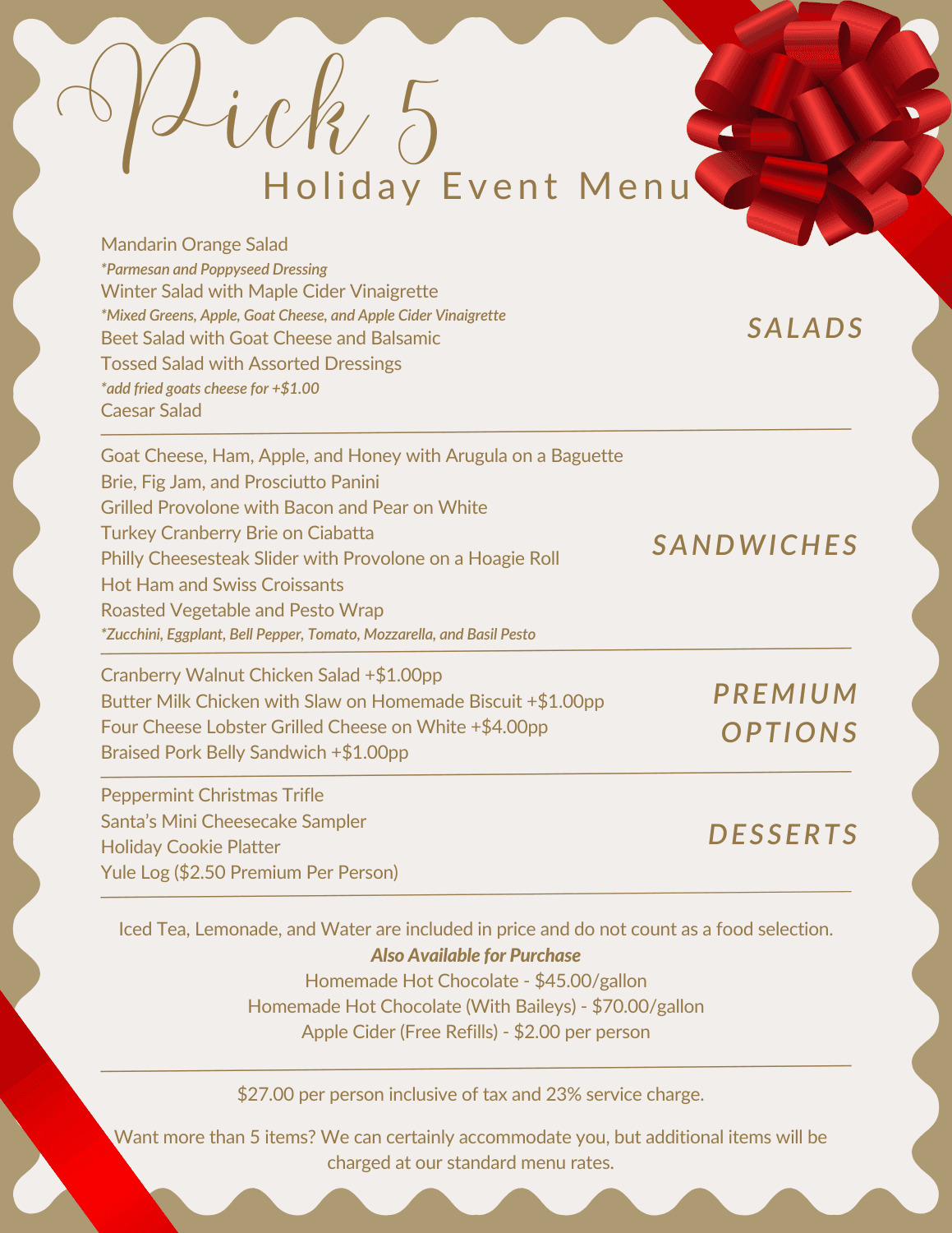For our "Pick 5 Holiday Lunch Menu", the event planner will choose 5 options from our salad, sandwich, and dessert offerings (ex. 2 salads, 2 sandwiches, and 1 dessert or 1 salad, 3 sandwiches, and 1 dessert). These 5 options will then be served family style on tables to guests, with at least 1 serving of each chosen option available for every individual in attendance unless noted otherwise. Premium options or more than 5 choices are available upon request, but will have an upcharge.
