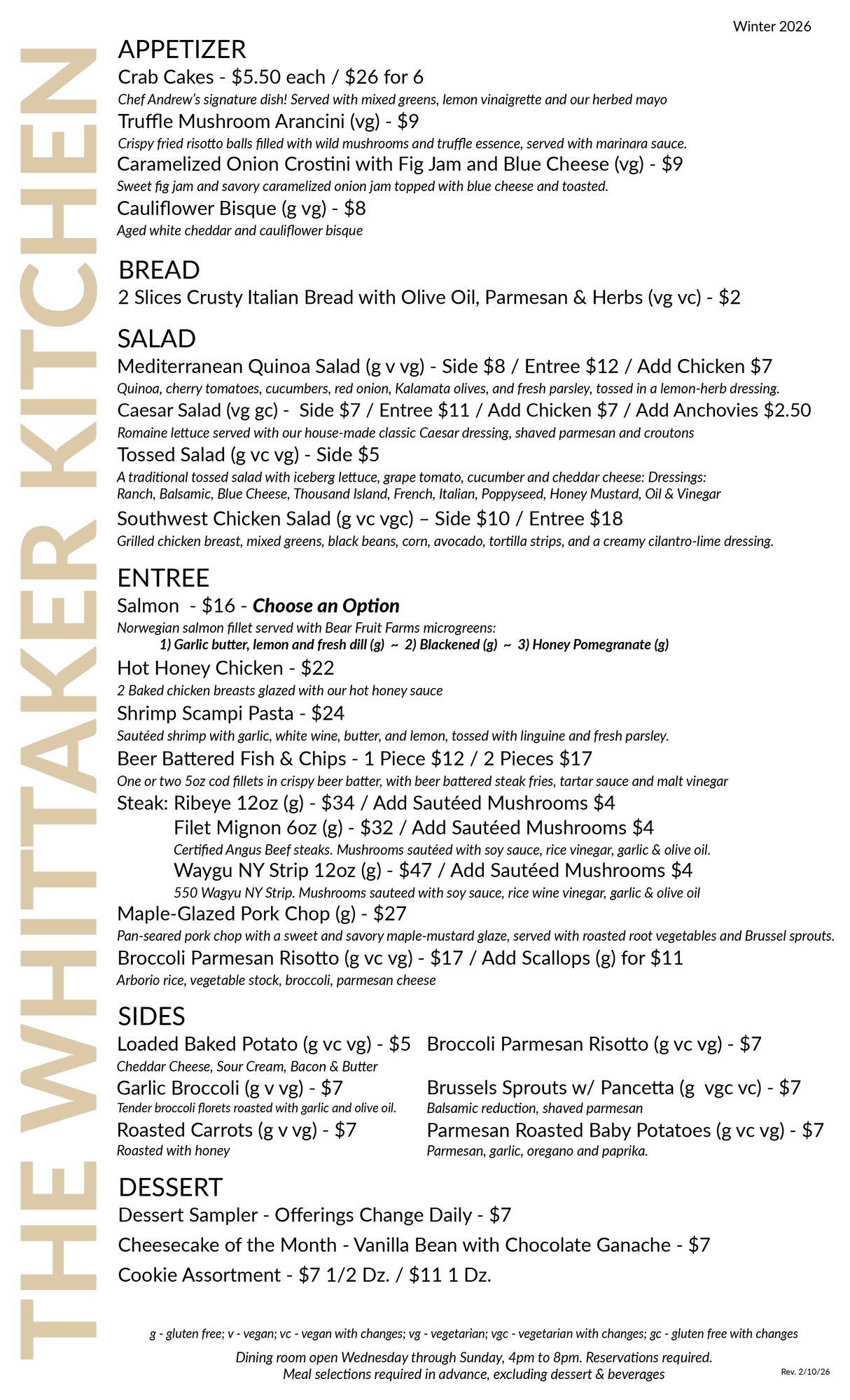 This menu will go into effect on 2/26/2026. If you need the menu for reservations prior to that date, please email info@thewhittakerinn.com