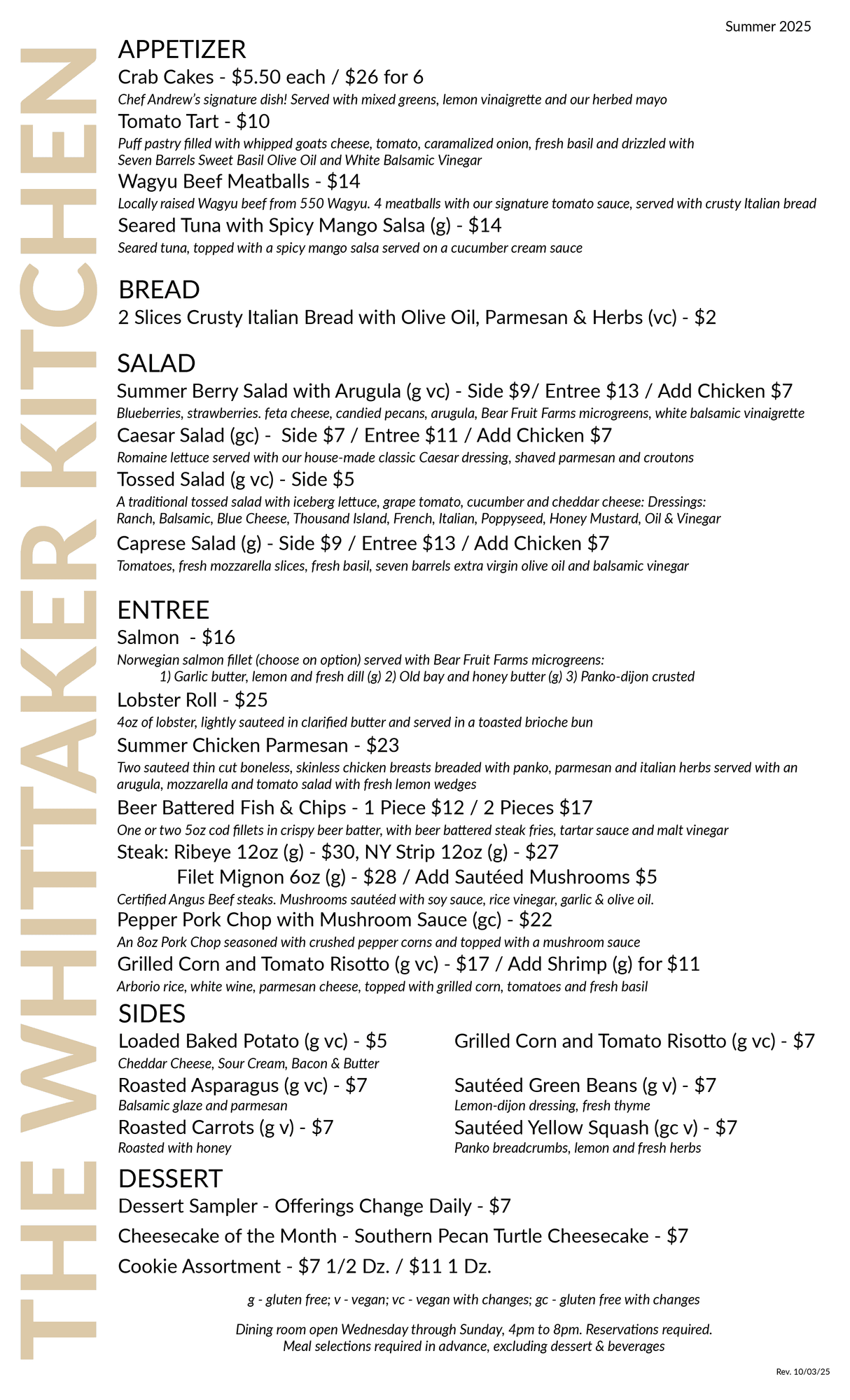 The Whittaker Kitchen Dinner Menu