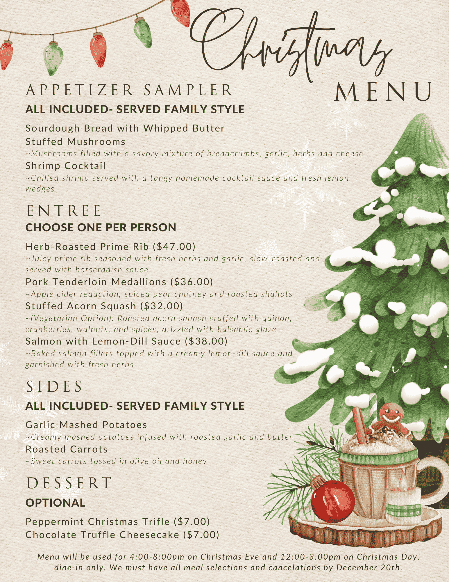Our specialty Christmas menu will be served from 4:00-8:00pm, dine-in only on Christmas Eve 2025.